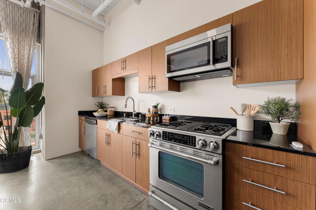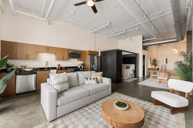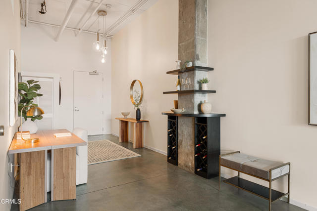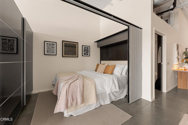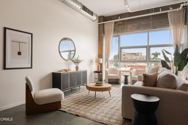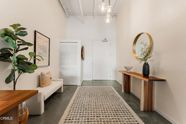Mountain views and blue skies stream through dramatic floor-to-ceiling, double-pane windows, setting the tone for this exceptional top-floor live/work loft. Soaring ceilings amplify the home's authentic industrial character, where concrete floors and exposed piping contrast with freshly painted, gallery-like white walls. The residence features a newer A/C system (installed in 2025) and a sleek, modern kitchen appointed with black granite countertops and stainless-steel appliances. The spacious bathroom offers an oversized soaking tub and a generous closet with in-unit laundry. A ceiling-mounted bike pulley system adds everyday convenience and functionality. Residents enjoy a resort-style rooftop retreat complete with a pool, spa, fire pits, cabanas, BBQ areas, and a fully equipped fitness center--bringing a sense of elevated, luxury living to the urban landscape. The unit includes one designated parking space with an EV charger in a gated garage, along with 24/7 security for added peace of mind. Ideally situated in the heart of the vibrant Arts District, you are moments from celebrated dining, coffee, and cultural destinations, as well as parks, transit, and major freeways. Experience the energy and creativity of one of Downtown LA's most dynamic and rapidly evolving neighborhoods.