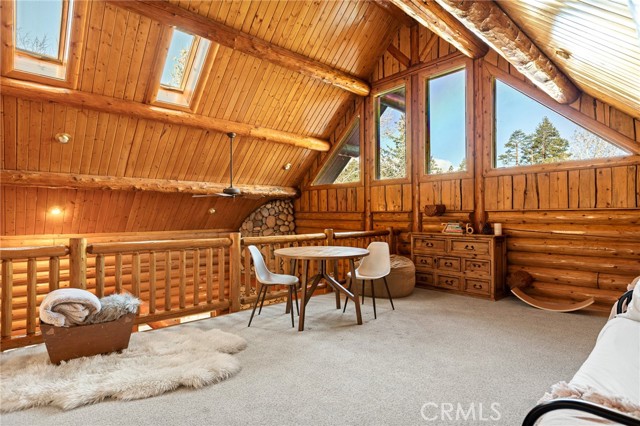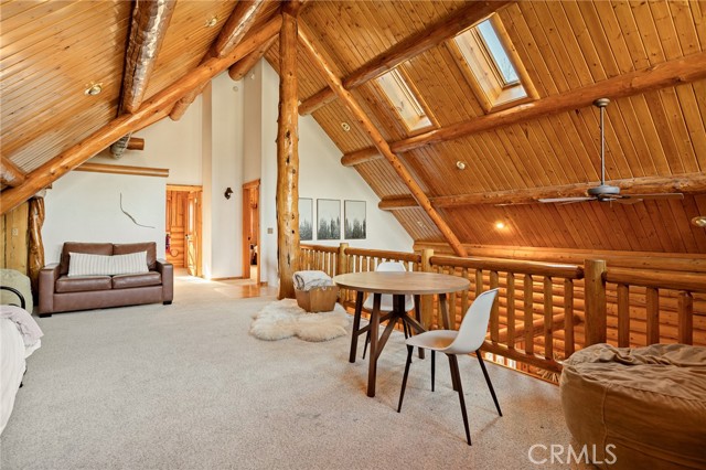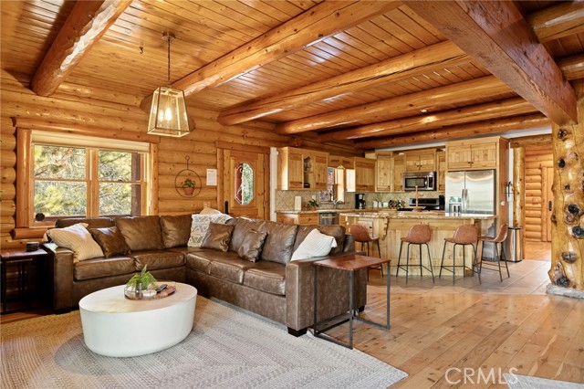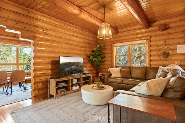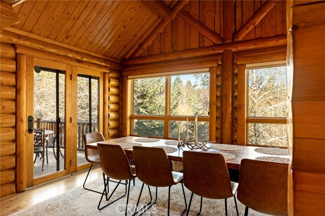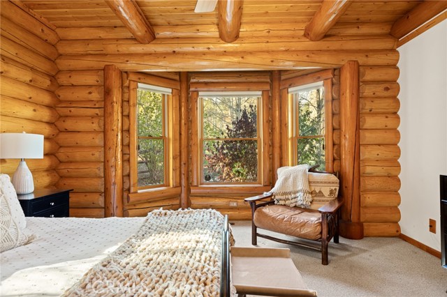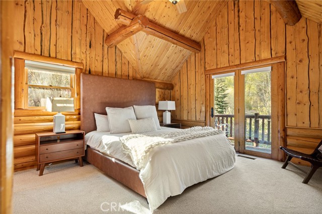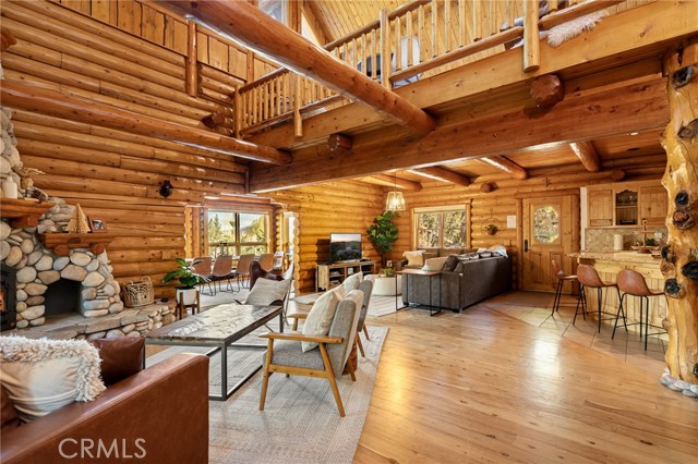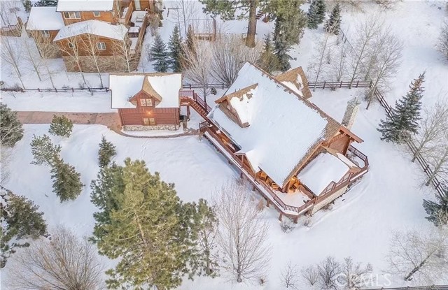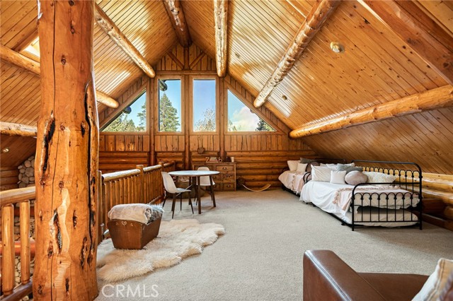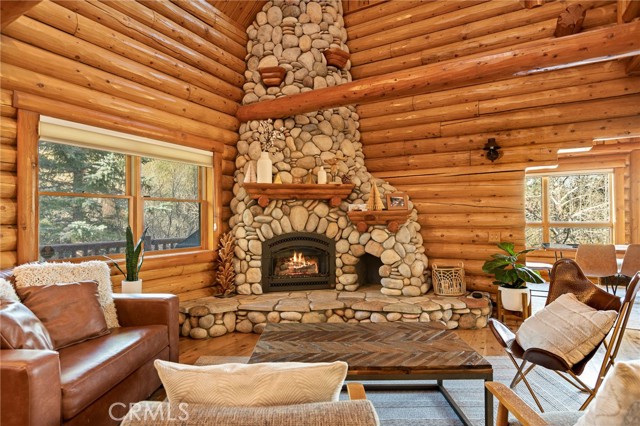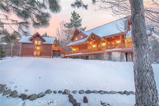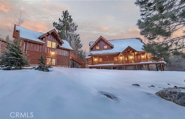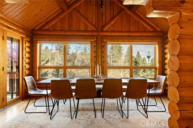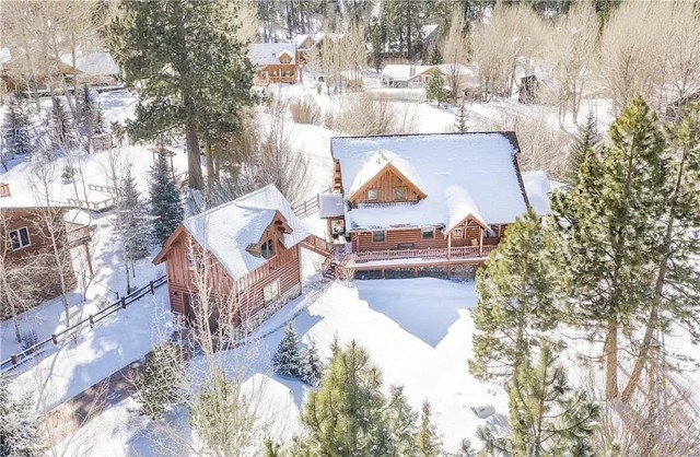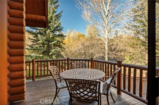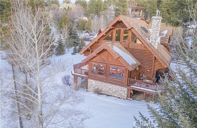 Tucked away in the serene beauty of the Moonridge area, this stunning Lindley-built full-log cabin offers a rare sense of peace, privacy, and connection to nature. With no home directly behind, the setting feels wonderfully secluded—surrounded by towering trees and breathtaking aspens whose leaves shimmer and flutter in the mountain breeze. A wraparound porch spans nearly the entire home, inviting you to relax, unwind, and fully take in the tranquil alpine surroundings. From the moment you arrive, this home simply feels special—one that must be experienced to truly appreciate. Inside, authentic full-log craftsmanship shines throughout, creating a warm and inviting mountain retreat. The dramatic floor-to-ceiling river rock fireplace anchors the living space, while vaulted ceilings and abundant windows fill the home with natural light. A gorgeous formal dining room, surrounded by windows and showcasing incredible views, opens directly to the back porch—creating the perfect setting for indoor-outdoor dining and entertaining. There's rich wood flooring, a beautifully appointed kitchen with granite countertops, and stainless steel appliances. The spacious layout includes a large loft with walk-in closet and a guest room above the detached garage with it's own heater/AC unit. The primary suite features a private balcony with views of the ski slopes, offering the perfect morning escape. Situated on over half an acre, the fenced and landscaped lot includes a seasonal stream, enhancing the peaceful, storybook setting. Additional highlights include a stamped and colored concrete driveway with ample parking, a large under-cabin storage room with workbench, and a brand-new heater. Located on a quiet street just minutes from Bear Mountain Ski Resort and the National Forest, with hiking trails nearby, this exceptional mountain home offers the perfect blend of privacy, beauty, and convenience. This is more than a home—it’s an experience.