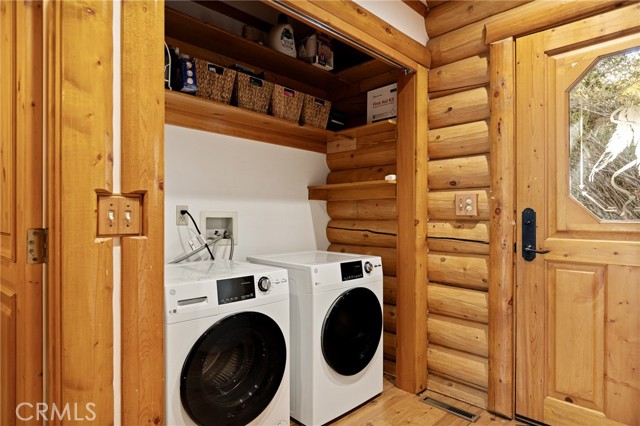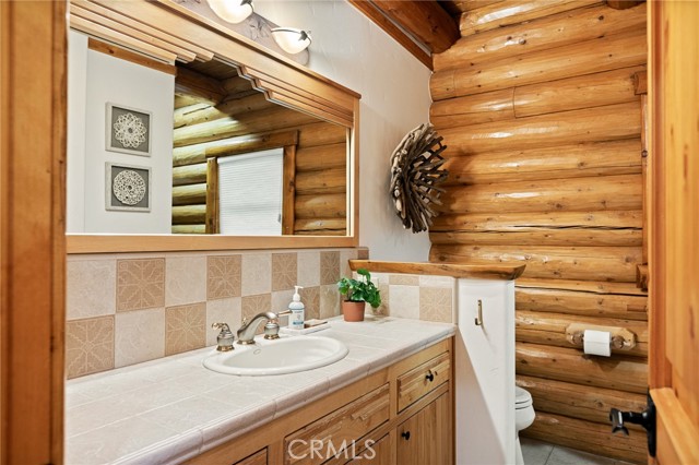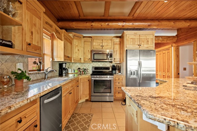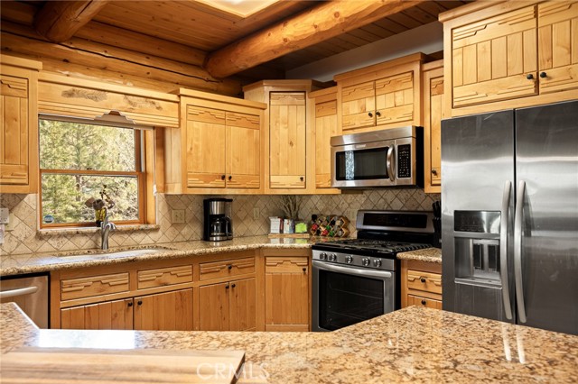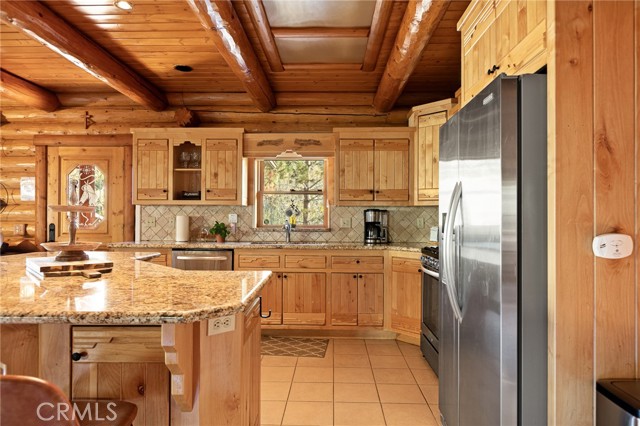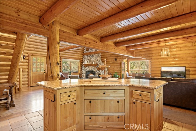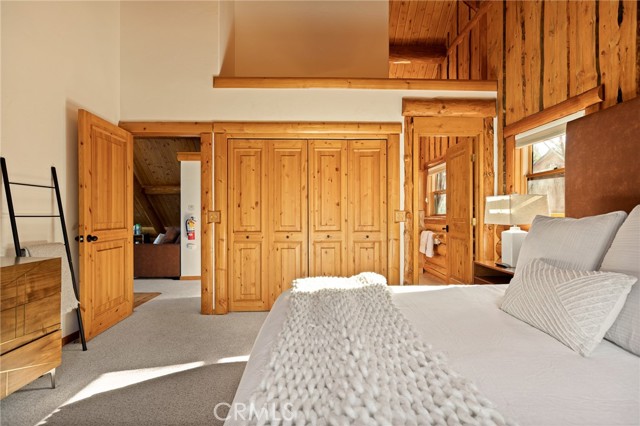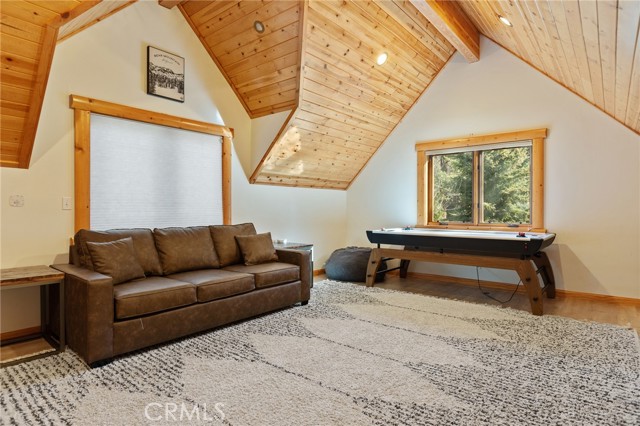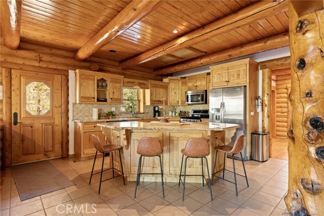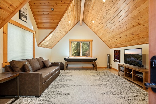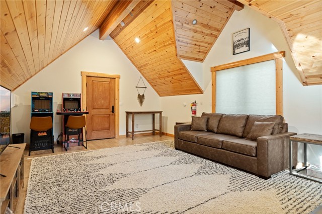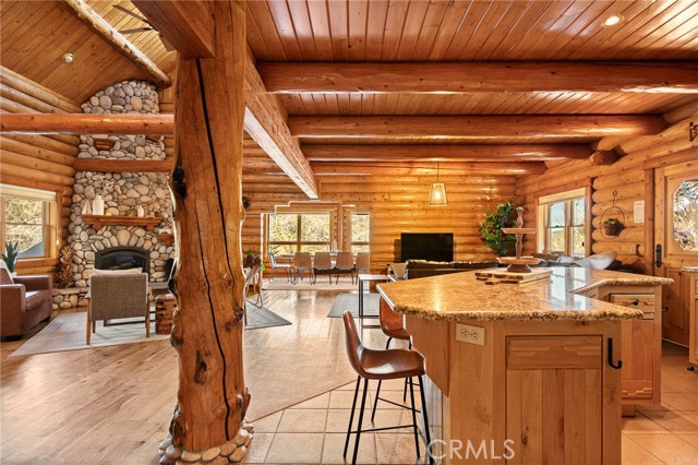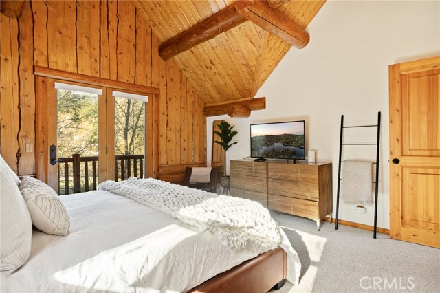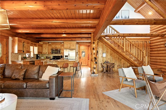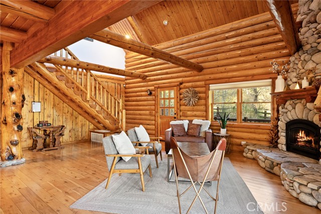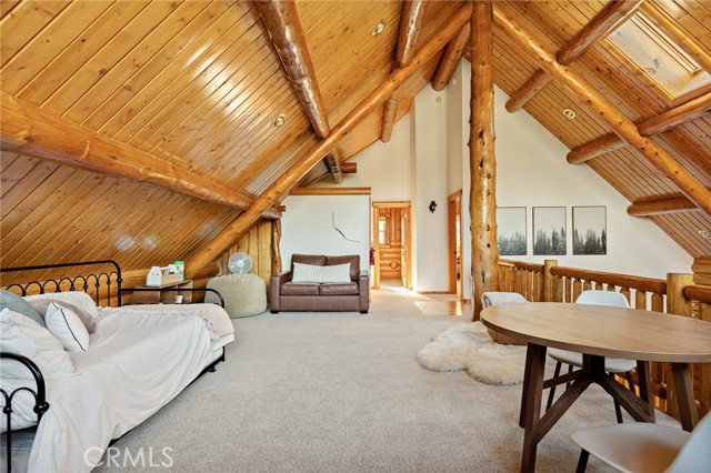 Tucked away in the serene beauty of the Moonridge area, this stunning Lindley-built full-log cabin offers a rare sense of peace, privacy, and connection to nature. With no home directly behind, the setting feels wonderfully secluded—surrounded by towering trees and breathtaking aspens whose leaves shimmer and flutter in the mountain breeze. A wraparound porch spans nearly the entire home, inviting you to relax, unwind, and fully take in the tranquil alpine surroundings. From the moment you arrive, this home simply feels special—one that must be experienced to truly appreciate. Inside, authentic full-log craftsmanship shines throughout, creating a warm and inviting mountain retreat. The dramatic floor-to-ceiling river rock fireplace anchors the living space, while vaulted ceilings and abundant windows fill the home with natural light. A gorgeous formal dining room, surrounded by windows and showcasing incredible views, opens directly to the back porch—creating the perfect setting for indoor-outdoor dining and entertaining. There's rich wood flooring, a beautifully appointed kitchen with granite countertops, and stainless steel appliances. The spacious layout includes a large loft with walk-in closet and a guest room above the detached garage with it's own heater/AC unit. The primary suite features a private balcony with views of the ski slopes, offering the perfect morning escape. Situated on over half an acre, the fenced and landscaped lot includes a seasonal stream, enhancing the peaceful, storybook setting. Additional highlights include a stamped and colored concrete driveway with ample parking, a large under-cabin storage room with workbench, and a brand-new heater. Located on a quiet street just minutes from Bear Mountain Ski Resort and the National Forest, with hiking trails nearby, this exceptional mountain home offers the perfect blend of privacy, beauty, and convenience. This is more than a home—it’s an experience.