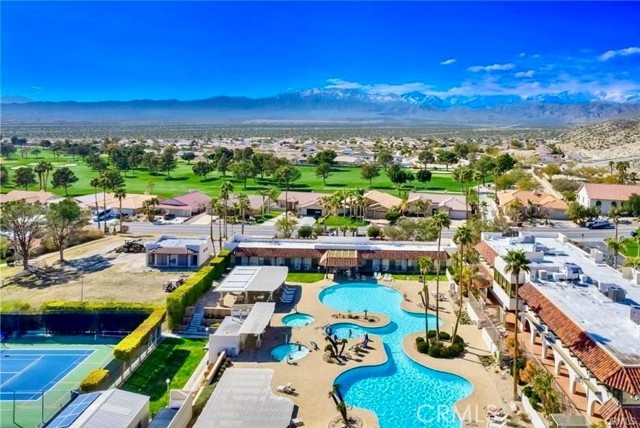 Great opportunity - live or an rental investments! Mission Lakes, a lushly maintained golf community featuring scenic walkways, ponds, swimming pools, and spas—just minutes from downtown Palm Springs. Residents enjoy the beautifully landscaped 18-hole golf course, clubhouse restaurant, cocktail lounge, onsite bar, tennis & pickleball courts, fitness center, and so much more. They have a very active social calendar. HOA dues Include unlimited golf for two (on title) water, trash, basic cable tv and internet. Worth every penny!! A yearly minimum food & beverage expenditure is required at the Mission Lakes Country Club restaurant and is charged regardless of use, encouraging residents to enjoy casual dining and social cocktail gatherings within the community. This upstair unit offers nice flooring, kitchen features stainless steel appliances, cabinetry, dishwasher and refrigerator. The bedroom opens to a private shaded patio with desert and mountain views, wide closet and another walk-in closets w built-ins for added storage.