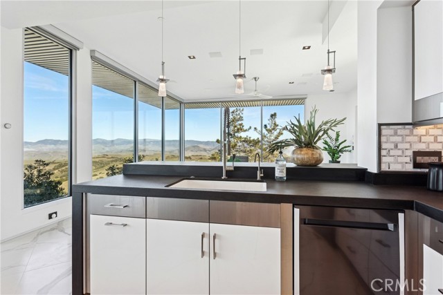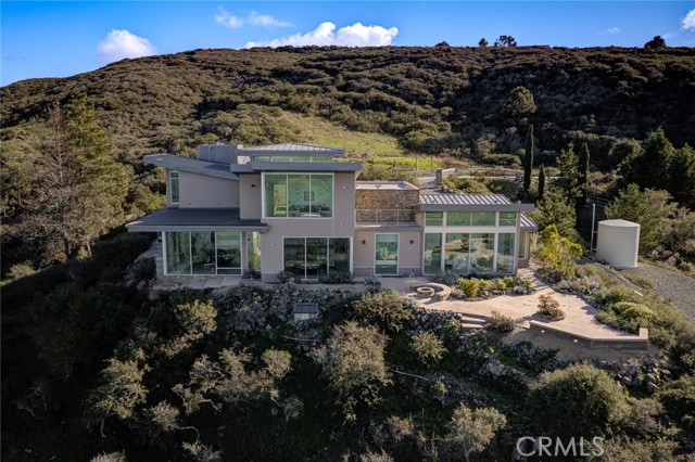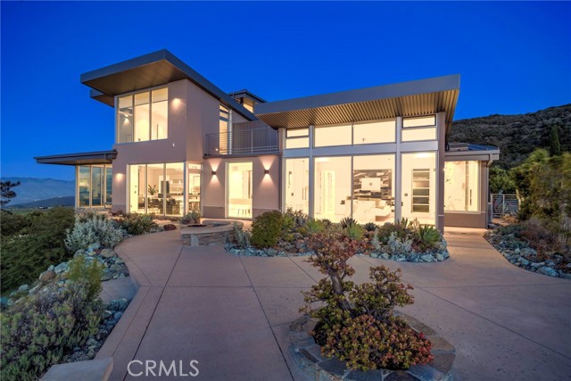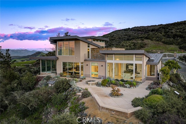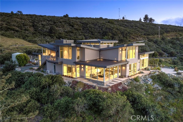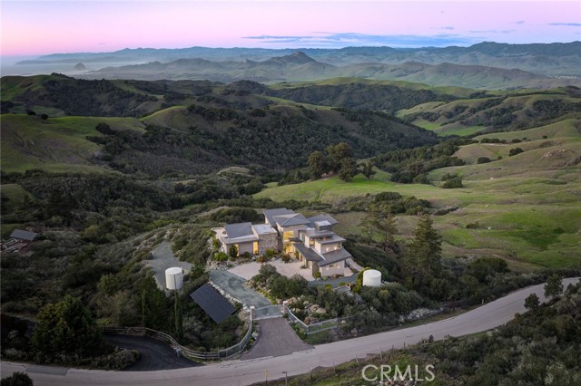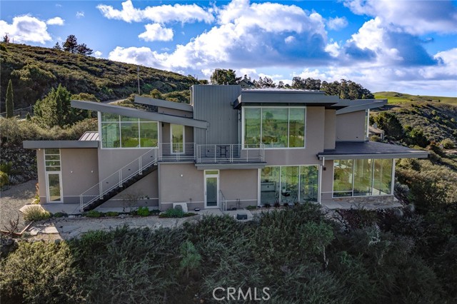 Where architectural masterpiece meets the horizon! This private hilltop estate is a modern, fully custom, luxurious residence commanding breathtaking panoramic views of Morro Bay, Coastal Ocean Vistas, and the Los Osos Valley. The residence is completely off grid with solar panels, Tesla battery backup, Kohler generator, two 10,000-gallon water tanks, and two 500-gallon propane tanks. Custom designed and built with uncompromising materials and attention to detail, the home showcases dramatic architectural lines with a striking blend of stone, metal, and floor-to-ceiling tinted and fluted glass encased in anodized aluminum frames, along with custom exterior panels across the roof, walls, fascia, and eaves. A gated driveway leads to a dramatic entry tower, opening to a light-filled interior where walls of glass frame endless Central Coast views. Custom features include automated blinds, Sonos sound system, heated floors, ceiling fans, and floor-to-ceiling porcelain tile. Open living spaces flow seamlessly for everyday living and entertaining. The guest suite offers a large private deck. The chef’s kitchen features Dacor Modernist graphite appliances, sleek two-tone acrylic cabinetry, a large island, vent hood, wine cooler, side-by-side tower fridge/freezer, and a built-in granite and steel dining table with a downdraft-vented Gaggenau wok. Additional amenities include porcelain flooring, full-height custom tile, high-end fixtures, tall Dayoris doors with fluted glass, custom lighting and undercounter lighting, retractable TVs, Murphy bed with workspace, security system, art nooks, and a spacious back patio positioned for sweeping views. Outdoor living includes a stone fire pit, outdoor shower, and integrated gathering areas designed for relaxation and entertaining. A junior ADU features a JennAir appliance package, two-tone acrylic cabinetry, granite countertops, and custom finishes, ideal for guests, extended family, or rental use with a separate entrance. The property also includes 400-amp service, Kohler standby generator, exterior fire-prevention sprinkler system, high ceilings, floating steel staircase, frameless barn doors, floating cabinetry, built-in beds and nightstands, and a 2.5-car garage with epoxy floors, sink, freezer, refrigerator, and workspace. Surrounded by breathtaking natural beauty, this private hilltop retreat is a place where your dream home becomes reality.