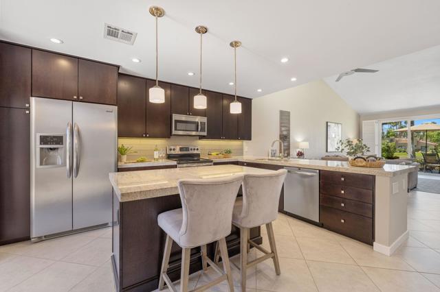 Welcome to Palm Valley Country Club--one of Palm Desert's most sought after, lush and vibrant communities featuring two championship Ted Robinson-designed golf courses set against beautifully manicured grounds. This guard-gated enclave offers an exceptional lifestyle with 24-hour security and patrol, while monthly HOA dues include social membership, cable, internet, trash, roof maintenance, and exterior paint, gardening service, 46 pools and spas throughout the community.Positioned on the 17th green, this beautifully remodeled residence captures breathtaking southern and western mountain views, perfectly framed by a serene lake with fountain features. The setting is private and quiet, ideally located close to the clubhouse but private at end of street with easy guest parking. A fully enclosed front courtyard creates a welcoming and intimate outdoor retreat, perfect for relaxing or entertaining.Inside, this turnkey furnished home has been thoughtfully updated throughout, offering a clean, modern feel ready for immediate enjoyment, interior laundry and a spacious two car garage adds functionality, while the overall layout embraces both comfort and effortless desert living.Palm Valley is uniquely one of the few communities permitting short-term rentals under 30 days in Palm Desert, making this an exceptional opportunity for investors, seasonal residents, or full-time homeowners alike. Optional membership programs unlock access to a 100,000 sq. ft. clubhouse with dining and lounge venues, a state-of-the-art fitness center, world-class spa, salon, lap pool, 13 tennis courts, and 12 pickleball courts delivering a true resort-style experience.