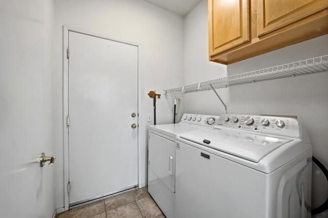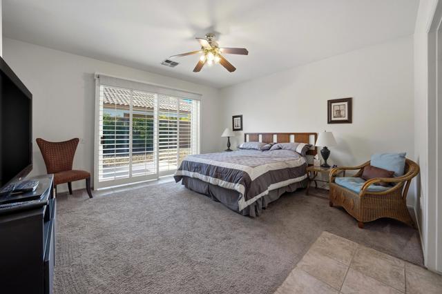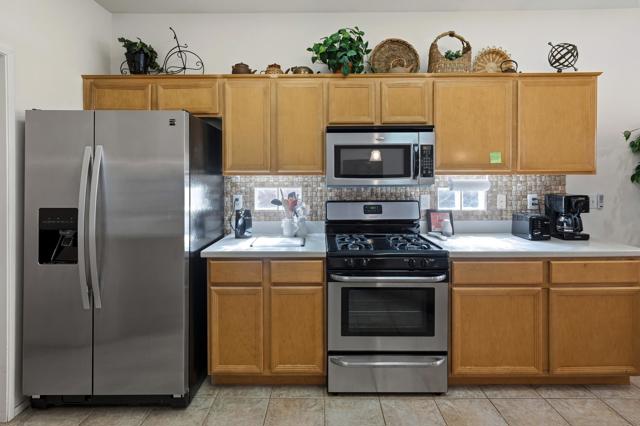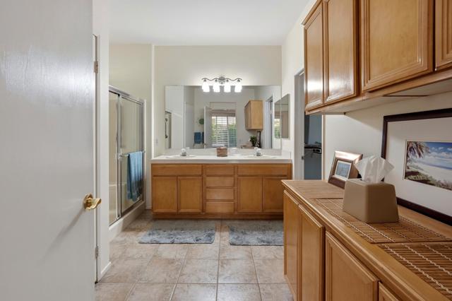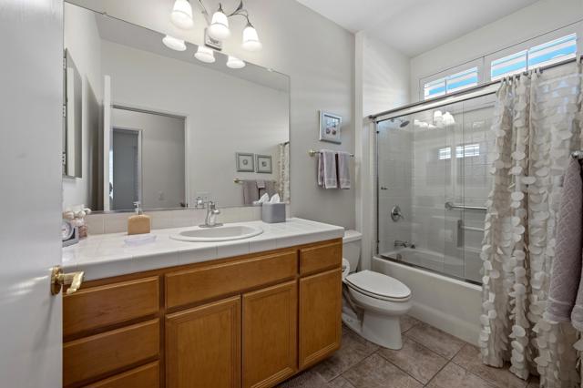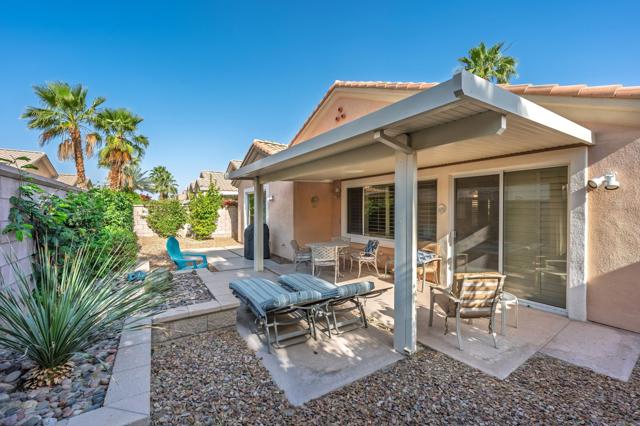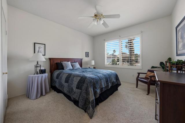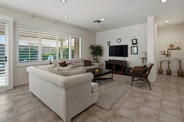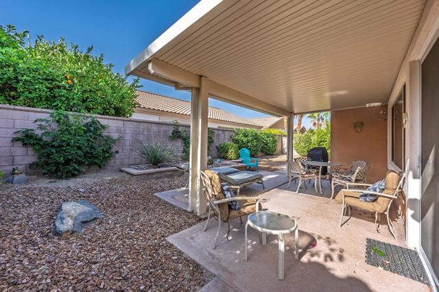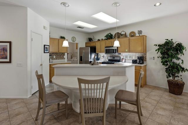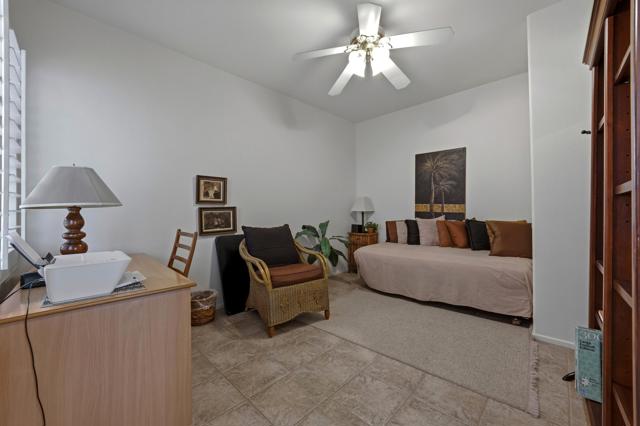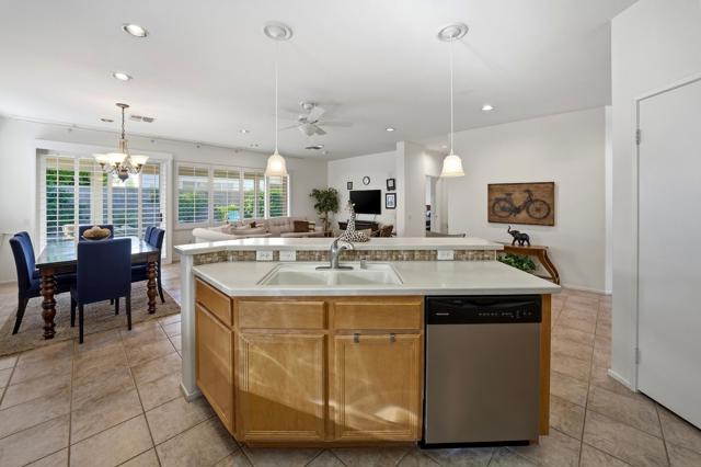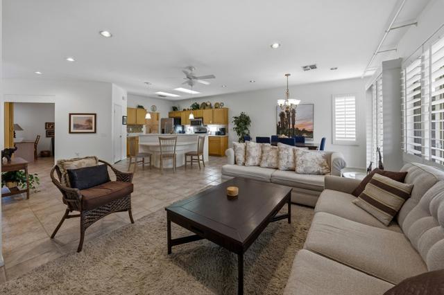 This St. Maarten model shows like a model. It is being offered ''turnkey'' furnished including a 2022 EZ Go golf cart. An open floor plan with 2BR/2B and den.Tile in most areas and carpet in BRs and inset carpet in great room. Plantation shutters are throughout. Ceiling fans in all traffic areas. Stainless appliances, corian counters and lovely backsplash and a walk-in pantry and large island for additional seating, Primary bedroom is large and has sliders to backyard. Primary bathroom has dual vanities and lots of storage. Laundry room is inside the home with additional storage cabinet. HVAC system replaced in 2024. Water heater replaced in 2025. Extended aluma wood patio cover in 2023. Backyard offers large seating areas with view to mature landscaping. 2 car garage has built-in storage cabinets.