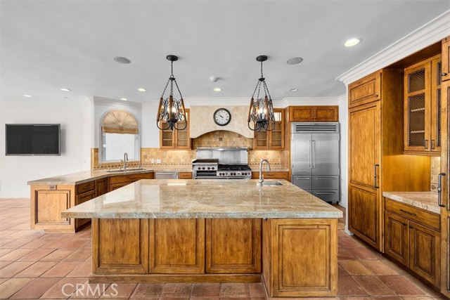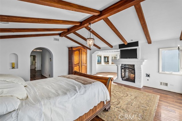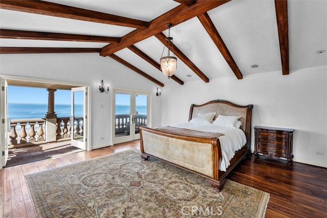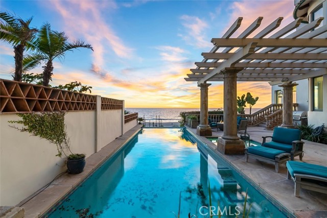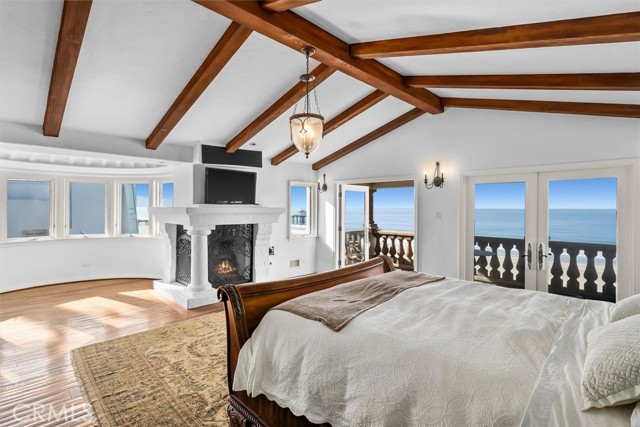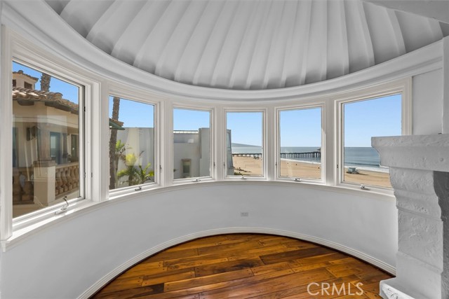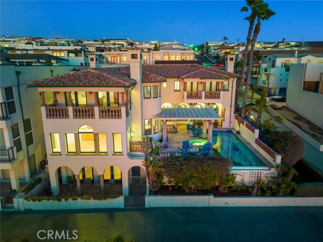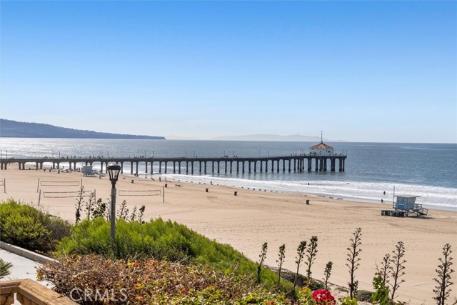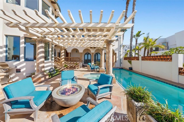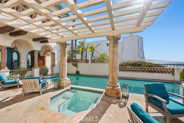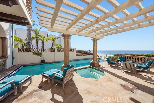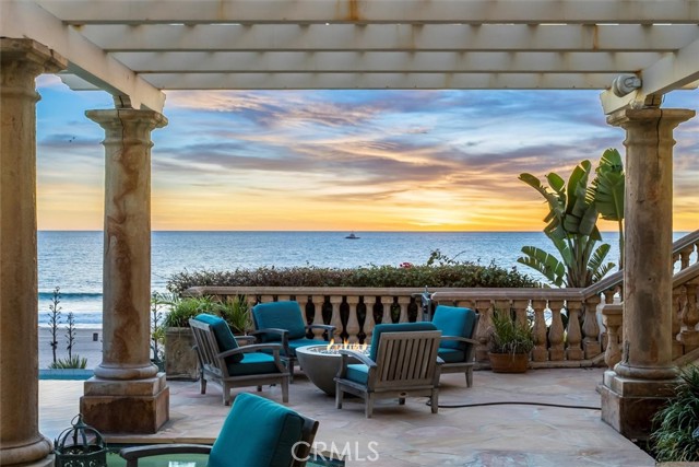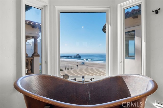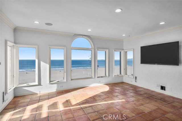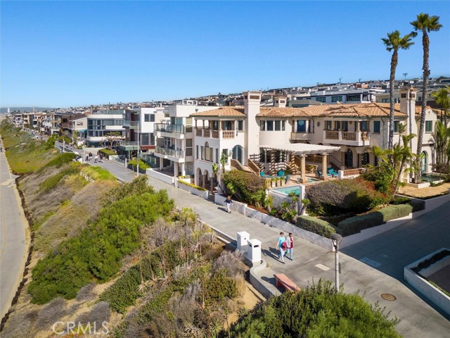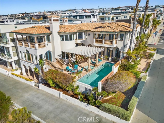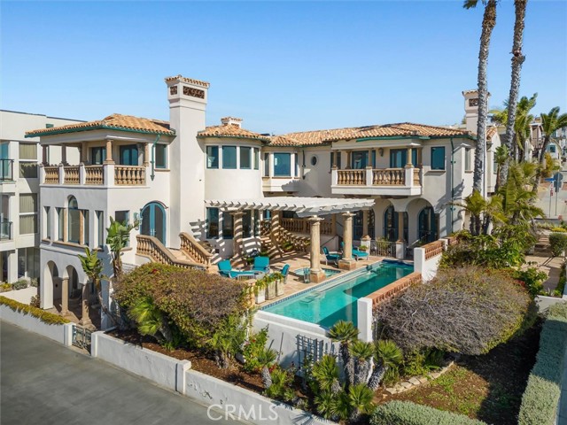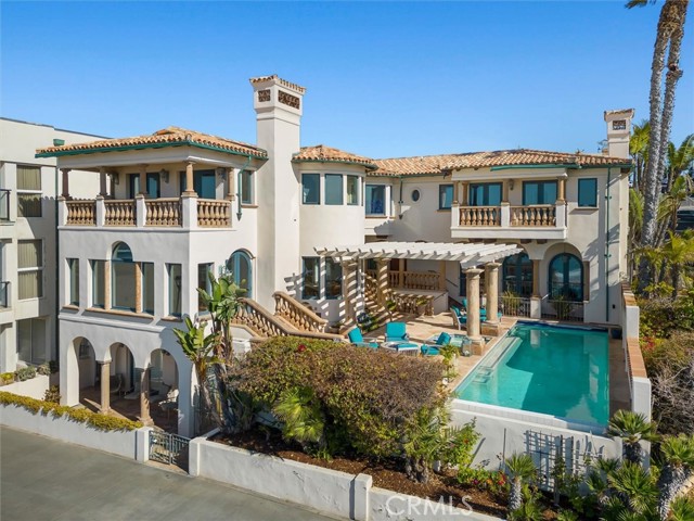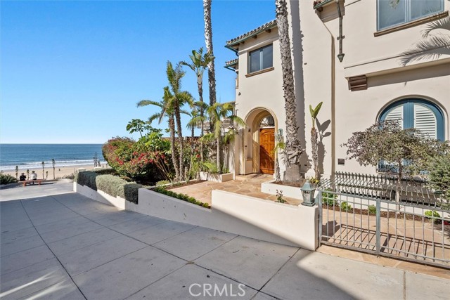 Poised along the Manhattan Beach Strand is a private retreat spread across an ultra-rare corner double lot, with a generous span of color-rich Pacific Ocean frontage. The idyllic oceanfront villa is just north of the Pier, featuring a custom home of approx 10,000 sf with 6 bedrooms and 9 bathrooms. The courtyard is designed as a fresh-air oasis where you stargaze by the firepit and unwind in the warm spa. Slip outside anytime for laps in the swimming pool, reflecting blue into the home via the many glass doors that merge main living spaces with the outdoors. There are oceanview dining spaces and a chef’s kitchen with a huge central island. A private living room with elegant crown molding, a fireplace and earthy tiles. Venture further to an airy salon with high ceilings and polished wood floors where guests mingle along the patio and terrace. The dramatic central staircase connects all three floors, gracefully curving upward to fix on blue sky and light pouring in from a grand skylight. The uppermost floor is home to balcony bedroom suites you can access by three staircases, or take the elevator directly to the extensive primary wing: This is a tucked-away haven with a separate sitting room, a super-sized bathroom and a fireplaced bedroom with oceanview balcony. Interiors are inspired by a grand coastal aesthetic; so is the amenity list. Guests shower and freshen up in the club-style changing room before joining the party in the plush bar and screening room. There’s a secluded wine room and a gym, plus a library/office with wall-to-wall cabinetry and coffered ceilings. The address is less than a 5 minute walk from boutiques and fine dining in Downtown, passing by the landmark red dome Pier along the way. It’s a fitting place for a villa that so perfectly suits the Beach Cities ideal of living, entertaining and nature under one roof.