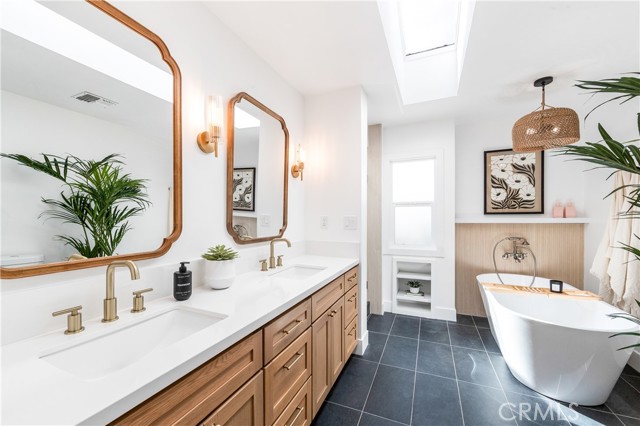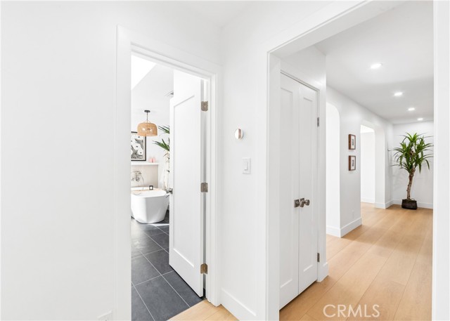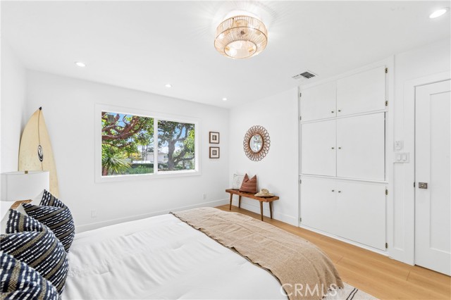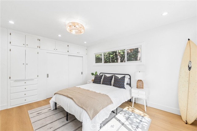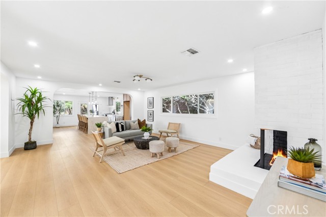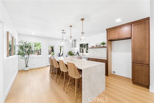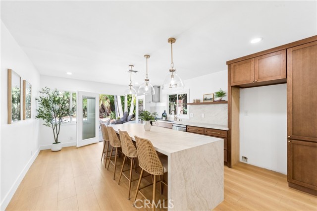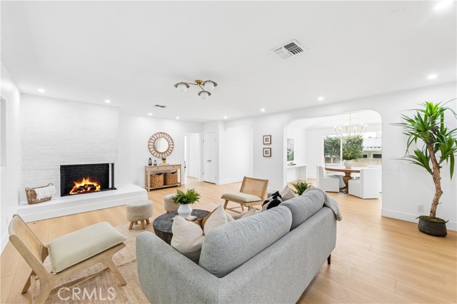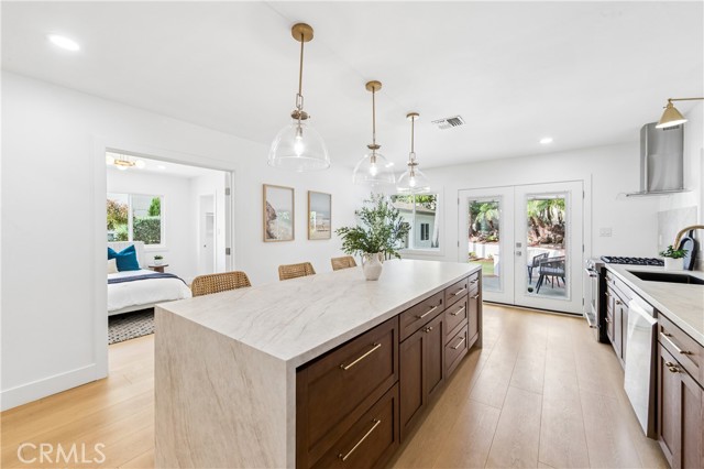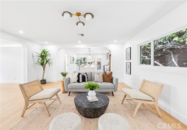 Welcome to a truly special, single-story, fully renovated retreat in the heart of Alamitos Heights. From the moment you arrive, this home makes a lasting impression. A serene stepping-stone pathway winds through curated landscaping to a charming pebbled lounge area and elevated grassy yard - a magical introduction to the peace and privacy that awaits inside. Step through the impressive entryway into an expansive, light-filled living space designed for both everyday comfort and unforgettable entertaining. The open-concept layout flows seamlessly into a stunning chef’s kitchen anchored by a dramatic 9-foot island wrapped in double Taj Mahal honed quartz waterfall edges, with seating for four. Custom cabinetry, all-new appliances, and thoughtful design details make this kitchen as functional as it is beautiful. Double doors open directly to the tranquil backyard oasis, complete with turf, swaying palms, and a soothing waterfall fountain - creating effortless indoor-outdoor living. Architectural archways and designer fixtures throughout the home add warmth and character, while the oversized formal dining room provides the perfect setting for gatherings large and small. Two generously sized bedrooms are positioned toward the front of the home and share a show-stopping full bath featuring dual vanities, designer tilework, a freestanding soaking tub, an oversized spa-like shower with skylights that flood the space with natural light. Privately situated at the rear of the home, the true primary suite offers a double-door entry, built-in cabinetry, a walk-in closet, and a spa-inspired en-suite bath complete with dual shower heads.The two-car garage has plenty of room for storage as well as a additional storage room behind the garage. The elongated driveway can fit plenty of cars and possibly an RV. Beyond its undeniable beauty, this home offers meaningful upgrades including copper plumbing, tankless water heater, new dual-pane windows, ABS sewer line, luxury laminate flooring throughout, recessed lighting, designer light fixtures, new wood siding, new fountain pump, central heat and AC with a Smart Thermostat for modern efficiency and comfort. Located in one of Long Beach’s most sought-after, family-friendly neighborhoods, with top-rated schools, this Alamitos Heights gem offers the rare combination of charm, sophistication, and turnkey peace of mind.