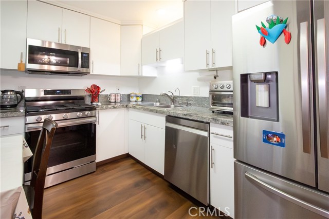 Welcome to this cozy , clean, bright, end-unit townhome in the highly sought-after Cabrini Villas hillside community! This beautiful and airy tri-level townhouse boasts private end views and direct access from the street. The spacious living and dining areas feature laminated floors and open to a large, private tiled patio—perfect for relaxing or entertaining. The brand-new kitchen includes sleek granite countertops, soft-close cabinets, and stainless steel appliances. Upstairs, you'll find three well-sized bedrooms, including a master suite with a large walk -in closet, private balcony, and a fully remodeled en-suite bathroom. The two additional bedrooms share a stylishly updated bathroom. The lower level offers a secluded two-car garage with laundry area and a bonus room, ideal for an office or hobby space. Cabrini Villas offers resort-style amenities, including 7 swimming pools, 4 spas, 6 lighted tennis courts, basketball and volleyball courts, playgrounds, and a clubhouse, all within beautifully landscaped grounds. With easy access to freeways, shopping, dining, and entertainment. This quiet and desirable end-unit townhome is truly one of a kind. Don't miss out on this exceptional opportunity! It might be sold fully furnished! Ask if you interested